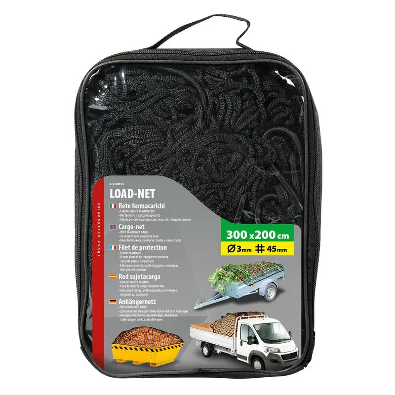 Rrjet├½ ngarkese – 300×200 cm – ├ÿ 3 mm. Me skaje elastike. P├½r t├½ siguruar mallrat e transportuara. P├½r shporta, bazamente, rimorkio, furgona dhe kamion├½.